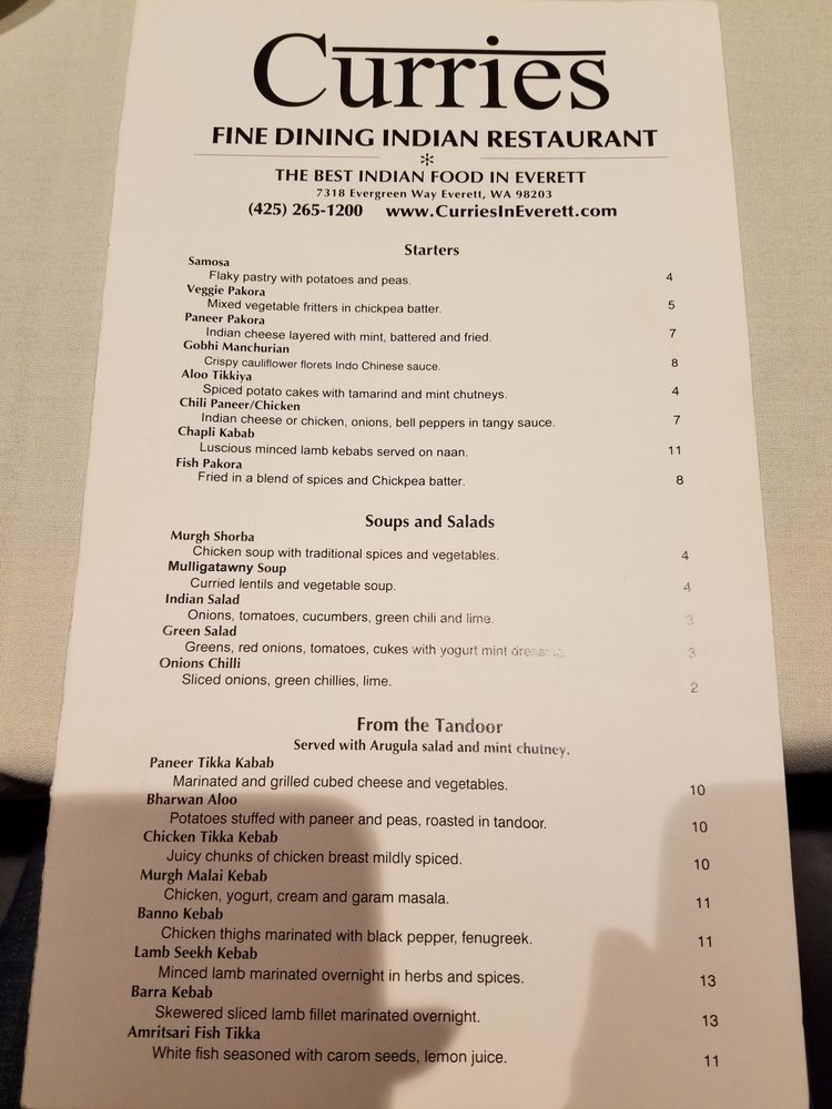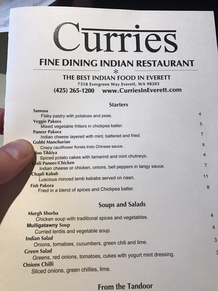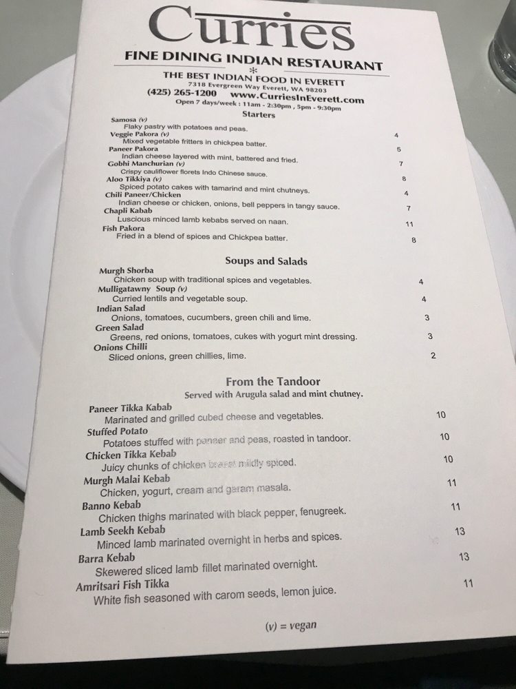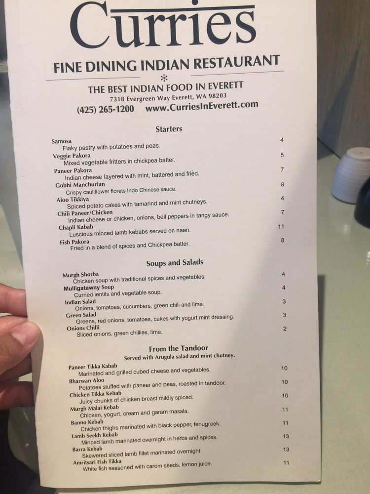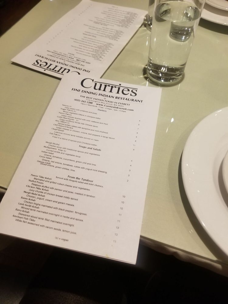 Curries is a restaurant located in Everett, WA, offering a diverse menu of Indian cuisine, salads, and desserts. The establishment provides various utilities such as delivery, takeout, reservations, and caters to vegan options. With a classy yet casual atmosphere, Curries is suitable for all occasions, including lunch and dinner. The menu boasts starters like samosas and veggie pakoras, soups and salads with traditional spices, and flavorful vegetable curries like Palak Paneer and Shahi Paneer. The dishes are prepared with attention to detail and authentic flavors, making each bite a delightful experience. The restaurant also offers amenities such as outdoor seating, private parking, and accepts various payment methods for convenience. Curries is a must-visit for those craving delicious Indian fare in a welcoming setting.